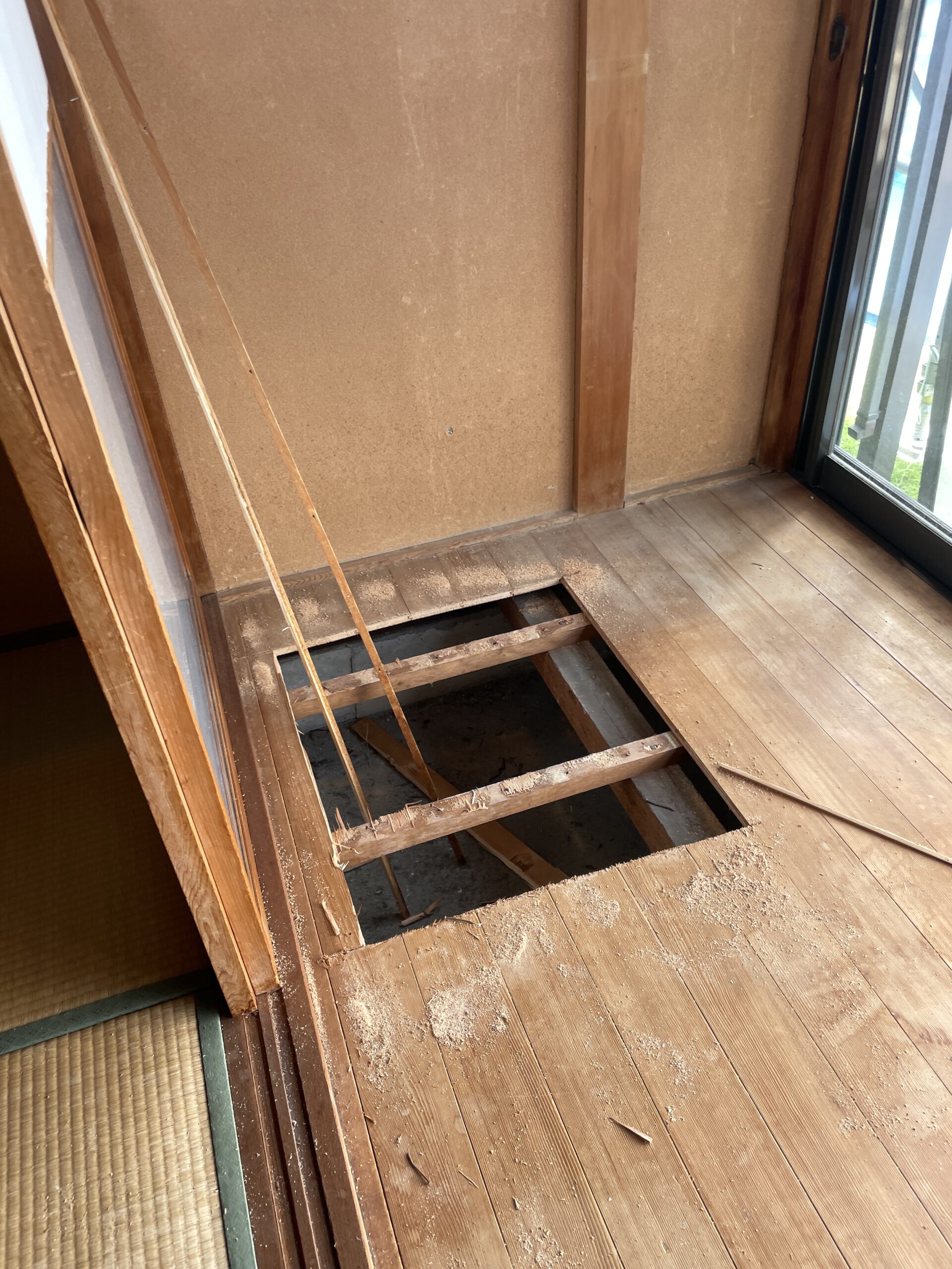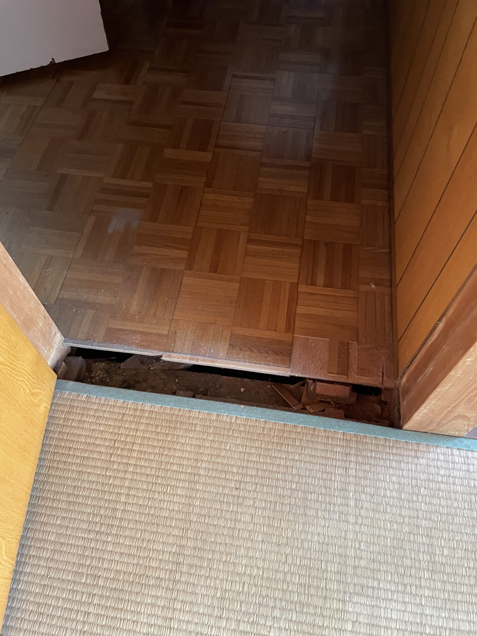 敷居を外したところ。敷居は欠きこみがされていてフローリングにしっかりと密着していた。大工の仕事がいい。